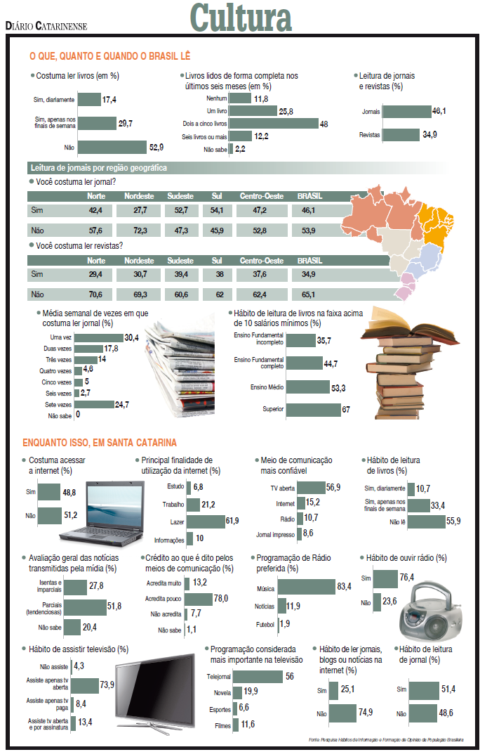 Internet é diversão. Televisão é informação. Jornal impresso é fidelidade. Assim pode ser definida a postura dos catarinenses em relação aos meios de comunicação, segundo a pesquisa Hábitos de Informação e Formação de Opinião da População Brasileira.
