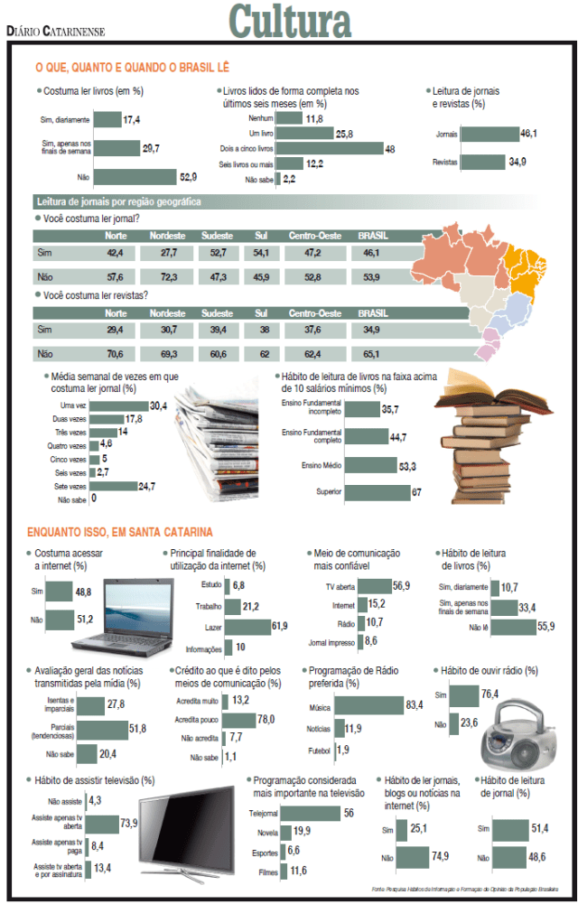 Em Santa Catarina, a credibilidade da internet foge ao padrão e atinge 15 pontos percentuais. No Brasil, as informações via rede recebem crédito de apenas 7%. O jornal impresso aparece em terceiro lugar. O grande patrimônio do impresso em Santa Catarina é a fidelidade do público, representada por um índice de leitura de 51,4%, maior do que o percentual nacional que é de 48,1%.