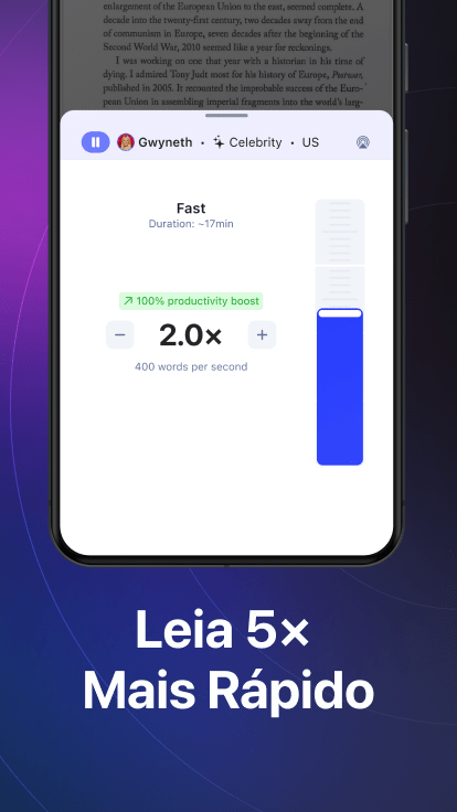 Você pode aumentar a velocidade até cinco vezes, dependendo de suas habilidades de escuta e preferência. Ouvir seu texto em menos tempo aumentará a produtividade e ajudará você a realizar mais. Você também pode pular frases específicas ou selecionar uma parte do áudio.